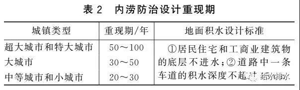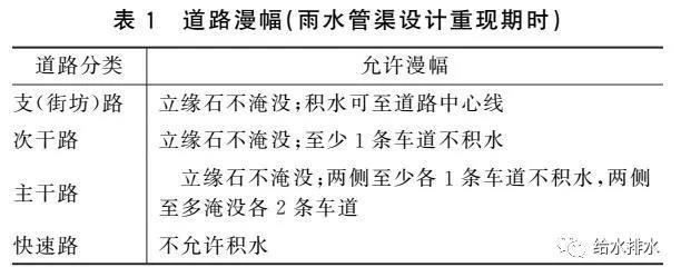 《Urban Storm Drainage Criteria Manual》对于内涝防治设计重现期时的道路积水有详细规定,我国《室外排水设计规范》有类似规定,见表2。