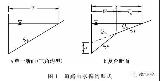 道路雨水偏沟主要有2种型式:单一断面和复合断面(见图1)。出于计算简便的需要,仅介绍单一断面(三角沟型)的计算方法。