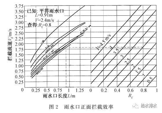 雨水口的泄水能力与道路的过水断面密切相关。对于安装在单向纵坡坡段的偏沟式雨水口,当流速较低时,雨水口正上方的雨水会被全部截流(即正面截流),同时,一部分雨水口正上方之外的雨水也会被截流(即侧面截流)。当纵向坡度太大,流速超过雨水口的拦截流速V0时,部分水流会越过雨水口,造成正面截流效率下降。V0越大,雨水口的截流效率越高。我国目前缺乏不同类型雨水箅子的拦截流速实测数据,经比较后发现,国家标准图集《雨水口》(16S518)中球墨铸铁雨水箅子和《Urban Drainage Design Manual》中P30型雨水口平面布局最接近,因此借鉴其拦截流速试验成果(见图2),经拟合后,可按V0=0.75+1.67 Le计算,一般在0.5~2.5 m/s。