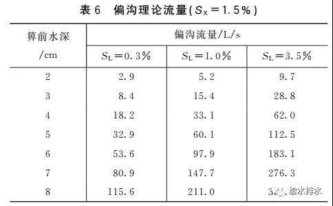 (1)雨水口泄水能力不应超过其偏沟流量,而我国标准图集泄水能力推荐值却超过了偏沟流量。对于箅前水深、道路横坡和纵坡一定的偏沟式雨水口,其偏沟流量是固定的(见表6)。对于箅前水深4 cm的偏沟式雨水口,偏沟式雨水口泄水能力不应大于18.2 L/s(SL=0.3%)、33.1 L/s(SL=1.0%)、62.0 L/s(SL=3.5%),这和箅子数量无关。