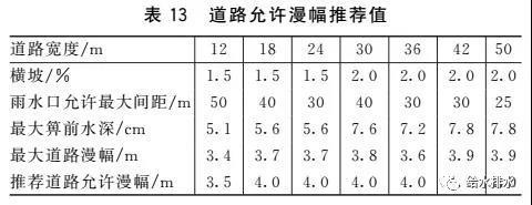 表14为道路纵坡为0.1%时的雨水口最小布置间距(满足表13漫幅要求)。