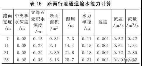 采用曼宁公式计算的路面行泄通道输水能力见表16(假设机动车和非机动车道宽度均为3.5 m)。