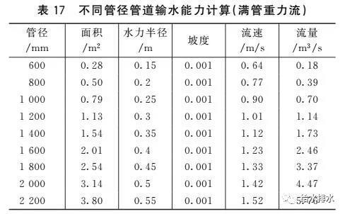 采用曼宁公式计算的不同管径管道输水能力见表17。