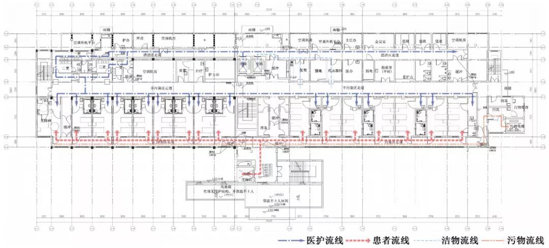 所谓负压隔离病房,是指采用空间分隔并配置全新风直流空气调节系统控制气流流向,保证室内空气静压低于周边区域空气静压,并采取有效卫生安全措施防止交叉感染和传染的病房。其病房楼标准平面布置必须包括且严格区分清洁区、半污染区、污染区、医务人员通道和病人通道,即“三区两通道”;“三区”相邻空间之间必须设置有组织气流并形成卫生安全屏障的“缓冲间”;其医疗流程过程中,必须严格执行更衣、沐浴、换鞋、洗手等卫生通过方式。以上海某医院老院区普通病房楼改建的负压隔离病房楼(下称改建病房楼)为例进行介绍,其标准层平面见图1,标准层流线见图2,病房轴侧示意见图3。