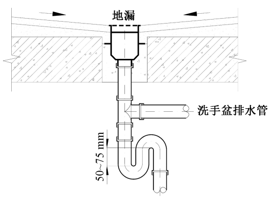 改建病房楼除了排水不常用的机房(如真空吸引机房、压缩空气机房、空调机房等)地漏采用可开启的密闭地漏以外,其余所有地漏均采用带过滤网的无水封直通型地漏加存水弯,其中病房卫生间、医护卫生间、污洗间等地面排水地漏采用洗手盆排水对地漏存水弯补水,特别是病房卫生间,病患如厕完毕用具消毒功能的洗手液洗完手,补充了地漏存水弯水封的同时,也将消毒液注入了存水弯,对抑制排水管内病原微生物的扩散是有利的。所有有效水封高度要求50~75 mm,补水时不得破坏有效水封,且应在疫情期间加强对地漏水封的定期补水措施。洗手盆对地漏存水弯补水示意见图7。