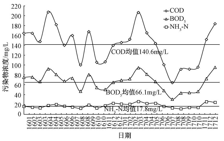 图1 老城区污水处理厂2016~2017年污染物进水浓度变化