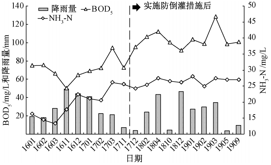 当月降雨量大于150 mm时,此时处于雨季,降雨多为强降雨。从图4中可以看出2017年11月前BOD5平均浓度53.7 mg/L,NH3-N平均浓度14.2 mg/L。2017年11月后BOD5平均浓度86.5 mg/L,NH3-N平均浓度22.1 mg/L。BOD5和NH3-N的平均浓度分别提升了61.1%和55.6%。由此可见在降雨量较大的月份,河水倒灌和降雨的叠加影响导致了污水处理厂污染物进水浓度的显著降低。在采取防倒灌措施后,雨季虽然降雨量较大,但从平均值水平来看,对污水处理厂的污染物进水浓度的影响是有限的。