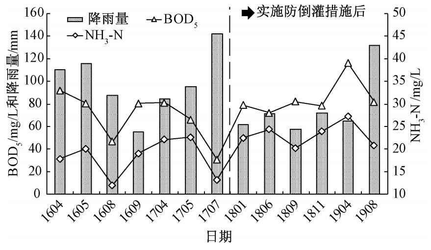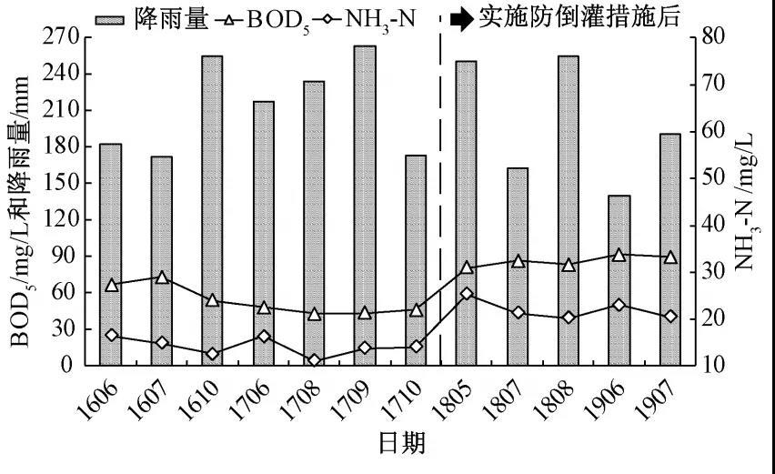 当月降雨量小于50 mm时,此时处于旱季,降雨基本不会影响管网水质。从图2中可以看出2017年11月实施防倒灌措施后,污水处理厂月均进水浓度显著上升。2017年11月前BOD5平均浓度71.0 mg/L,NH3-N平均浓度19.7 mg/L。2017年11月后BOD5平均浓度103.4 mg/L,NH3-N平均浓度24.2 mg/L。BOD5和NH3-N的平均浓度分别提升了45.6%和22.8%。
