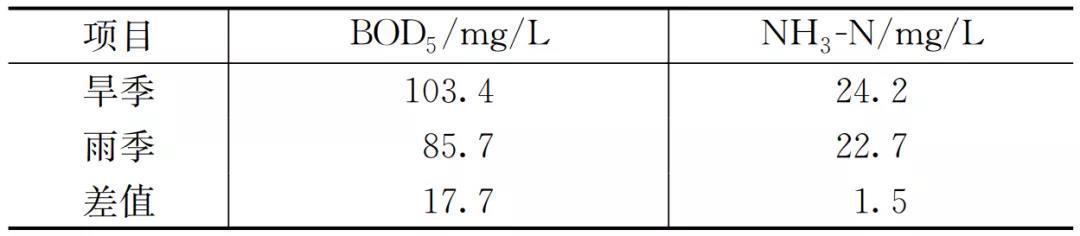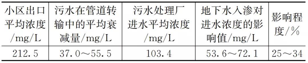 地下水入渗量与地下水水位、降雨、河水倒灌以及管道漏损等情况均息息相关。为了初步量化分析入渗的影响,拟采用老城区污水处理厂实施防倒灌措施后旱季的实测进水数据反算地下水入渗的影响。此时主要影响污水处理厂浓度的因素为地下水的入渗、污染物转输过程的沉积和降解。地下水入渗对进水浓度的影响值=小区出口浓度-污水在管道转输中的衰减量-污水处理厂进水平均浓度。根据表2可知地下水的入渗对污水处理厂进水BOD5浓度的影响程度约25%~34%。这充分的反应出地下水位较高的老城区,管网的渗漏对污水处理厂进水浓度影响非常大。