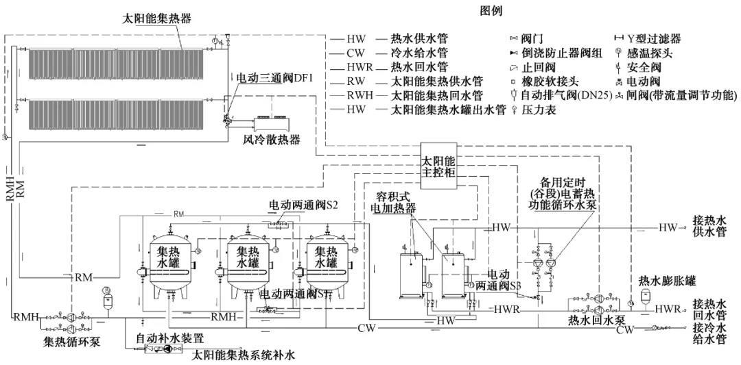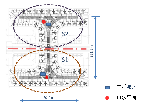 中水水源来自基地再生水,由再生水处理站引出一路DN300再生水管供卫星厅冲厕用水及隔油机房、路面冲洗用水,再生水的供水压力不小于0.25 MPa。S1、S2卫星厅分别设置独立的中水系统。中水系统分区及供水方式同生活给水系统。热水系统供热方式