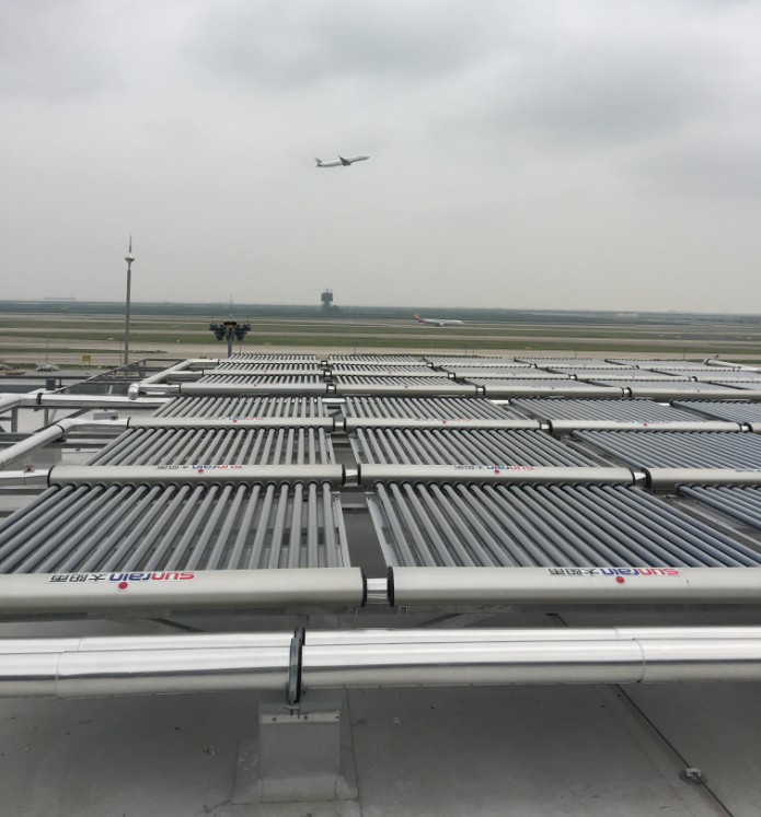 太阳能集热器作为太阳能热水系统的关键部件,同时又是整个系统中所占空间最大的部分,它在建筑中的布局将直接影响整个系统与建筑的结合效果。设计采用玻璃金属真空管太阳能集热器,集热效率高,可减少集热器面积。如下图所示,卫星厅太阳能集热器设在第二层混凝土次屋面上,集热器支架与屋面的连接构造简便,系统管线隐蔽,对建筑立面无影响,且便于上人安装维护。为避免集热器眩光对航线以及飞机起降产生影响,对集热器表面采取了亚光处理。