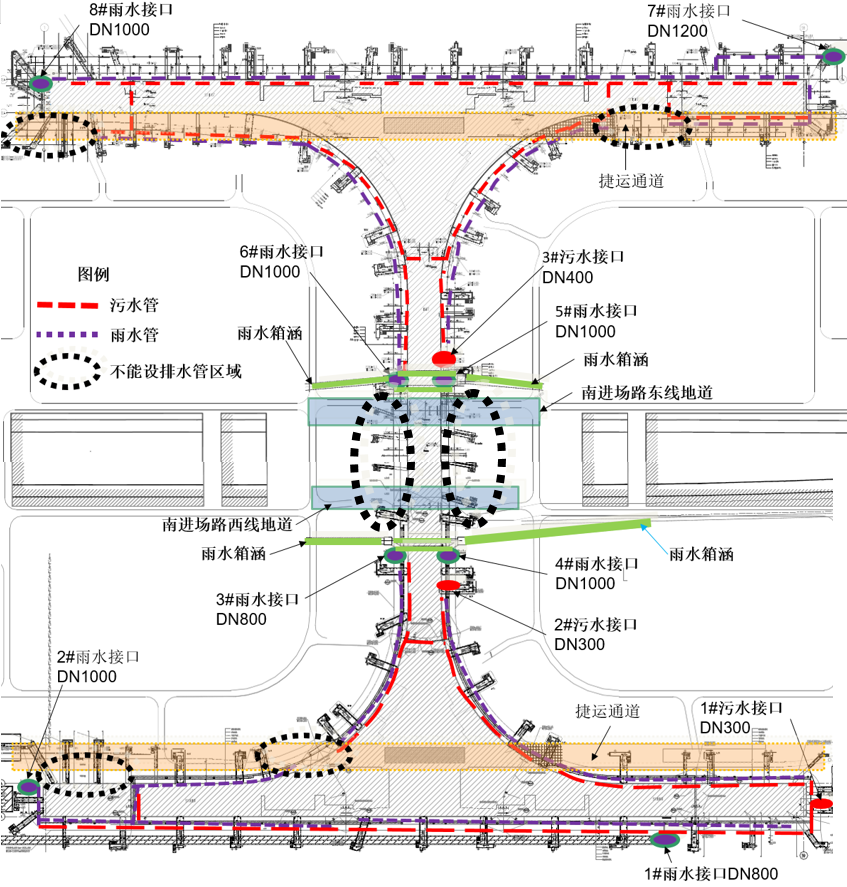 在规划设计排水管道的管线时,还需注意对室内雨污水排出管的影响。在中指廊两条雨水排水箱涵之间区域、S1和S2北指廊端部区域等,受地下构筑物的影响,无法设置室外雨、污水管道。因此,室内的卫生间应避免在上述区域附近设置,屋面虹吸雨水排水系统需设悬吊管,转接到设有室外雨水管道的一侧接出。其次,管线铺设控制在靠近卫星厅外墙10 m内,尽量避免设在10~22 m的服务车道下面。这样既可避免管道及检查井长期受车辆重压而损坏,又可避免由于管道维护影响服务车辆的通行,还可避免雨污水井盖与路面不平而引起的车辆颠簸。