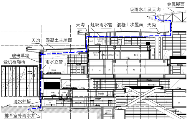 超大型建筑的屋面雨水排水,一般需采用虹吸雨水系统,其中各雨水斗之间的水量平衡、雨水立管的巧妙安排等细节处理,在设计中应给予充分的重视。
