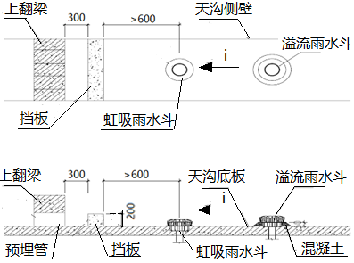 设计将混凝土天沟内的虹吸雨水斗靠近柱子边设置,同一条天沟内斗与斗之间间距为18 m(同柱子间距一样)。天沟内坡度为1.6%,为了确保雨水能依自由水头均匀分配至各雨水斗,如按规范要求需要设置下沉小斗达800个以上,会增加土建的施工难度和工程造。因此,设计采用了在雨水斗后面设置200 mm高的挡板,以保证每个虹吸雨水斗所承担的雨水量均衡,防止天沟内的雨水集中流向标高低的下游。最上层金属屋面天沟约每隔30 m需设有变形缝,变形缝将整个金属天沟分为若干段,由于天沟坡度较大(坡度≥4%),需在每段金属天沟的最低处设置集水槽和虹吸雨水斗。