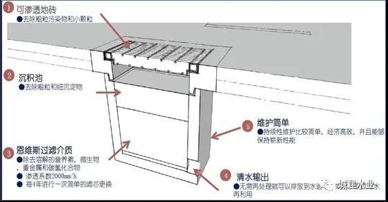 (7)岗哨井岗哨井是一种利用过滤介质吸附雨水中的泥沙、污垢等颗粒物,起到净化雨水,削减面源污染的作用,可将岗哨井置于地表面源污染负荷较高的商业用地附近,进行雨水过滤净化。
